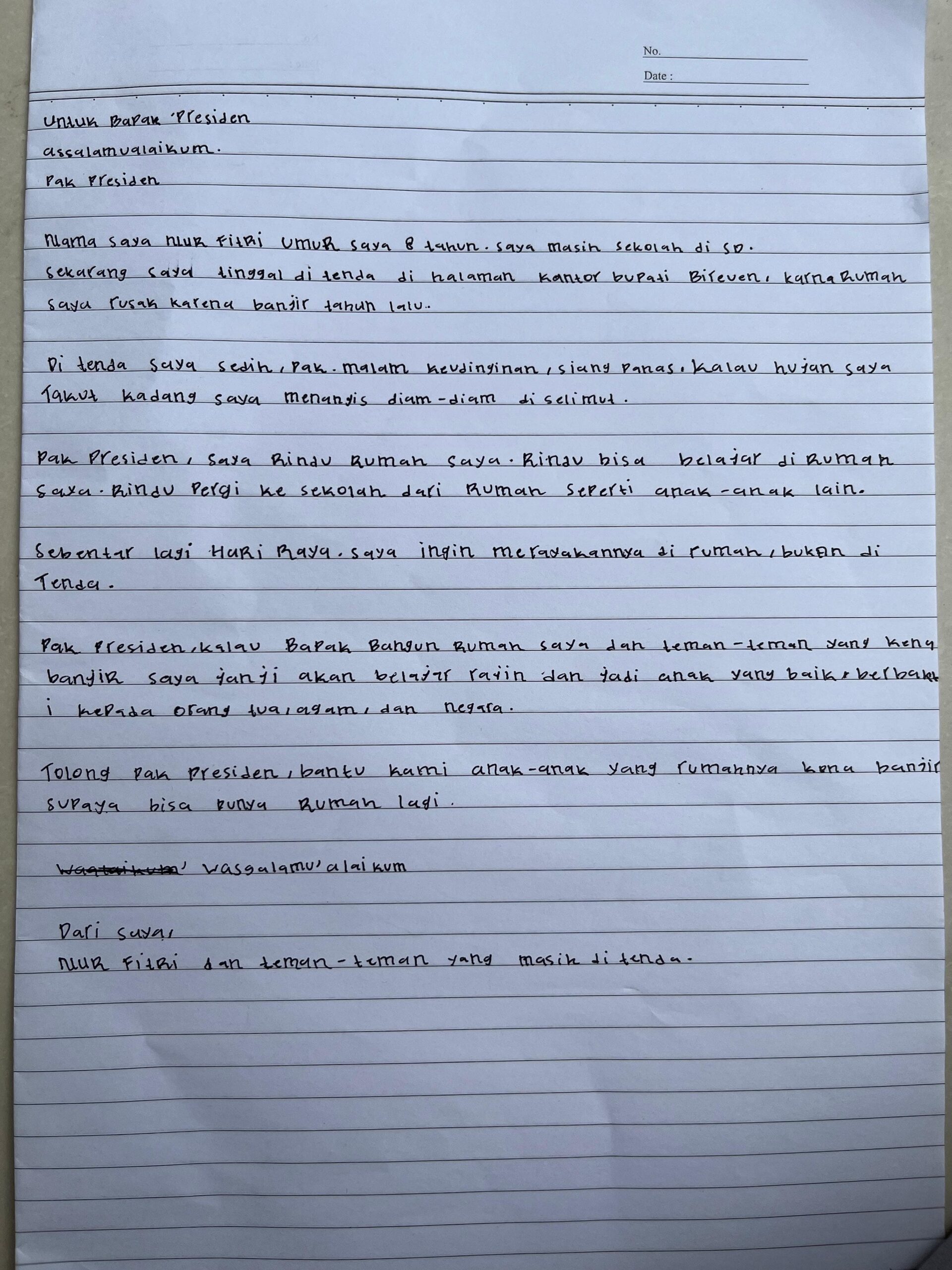 “Kondisi di tenda jauh dari kata nyaman, terutama bagi kami anak-anak,” ungkapnya dalam surat yang menjadi potret nyata kondisi korban bencana di daerahnya.