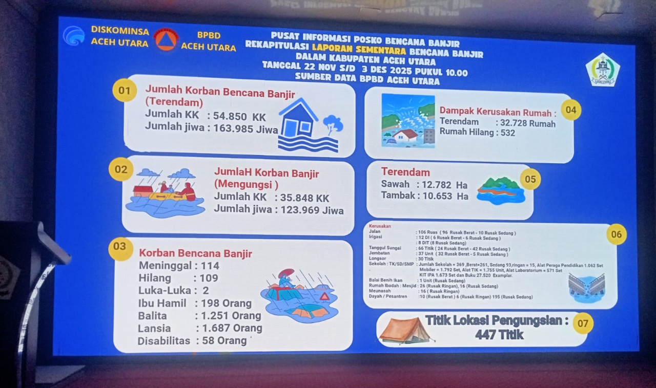 Hingga Rabu, 02/12/2025, Pemkab Aceh Utara melaporkan 121 korban meninggal dunia dan 118 orang masih hilang, selain korban jiwa, banjir juga menyebabkan kerusakan masif pada infrastruktur publik, hilangnya tempat tinggal warga, serta merusak fasilitas umum di banyak gampong.