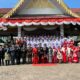 KOTA JANTHO (Waspada): Tarian Massal Sanggar Keumala Hayati berkolaborasi dengan Marching Band Kudeta Drumline SMA Negeri 1 Kota Jantho, tampil pada peringatan Hari Ulang Tahun (HUT) ke-79 RI, di Lapangan Bungoeng Jeumpa, Kota Jantho, Aceh Besar, Sabtu (17/8).