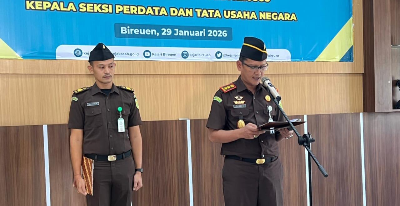 Pelantikan pejabat baru dan penyerahan jabatan dari pejabat lama berlangsung di Aula Kejari Bireuen pada Kamis (29/1), dipimpin langsung oleh Kepala Kejaksaan Negeri Bireuen, Yarnes.