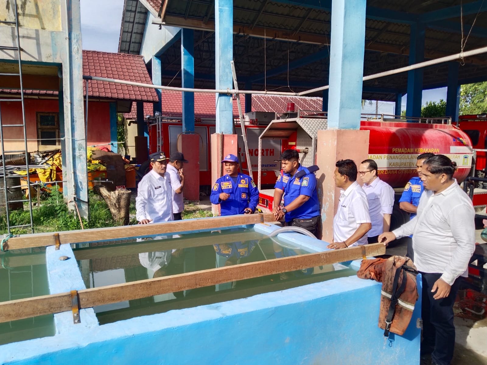 KOTA JANTHO (Waspada.id): Wakil Bupati Aceh Besar, Drs H Syukri A Jalil, meninjau kesiapan petugas pemadam kebakaran di Pos Induk Wilayah Manajemen Kebakaran (WMK) 02 Sibreh Keumude, Kecamatan Sukamakmur, Kabupaten Aceh Besar, Rabu (8/10).