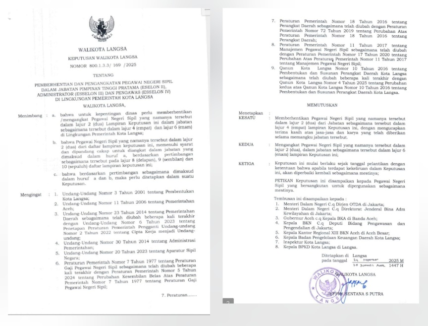Pelantikan tersebut berdasarkan keputusan Wali Kota Langsa Nomor 800.1.3.3/ 169 /2025 tentang Pemberhentian dan Pengangkatan Pegawai Negeri Sipil dalam Jabatan Pimpinan Tinggi Pratama (Eselon II), Administrator (Eselon III) dan Pengawas (Eselon IV) di Lingkungan Pemerintah Kota Langsa.