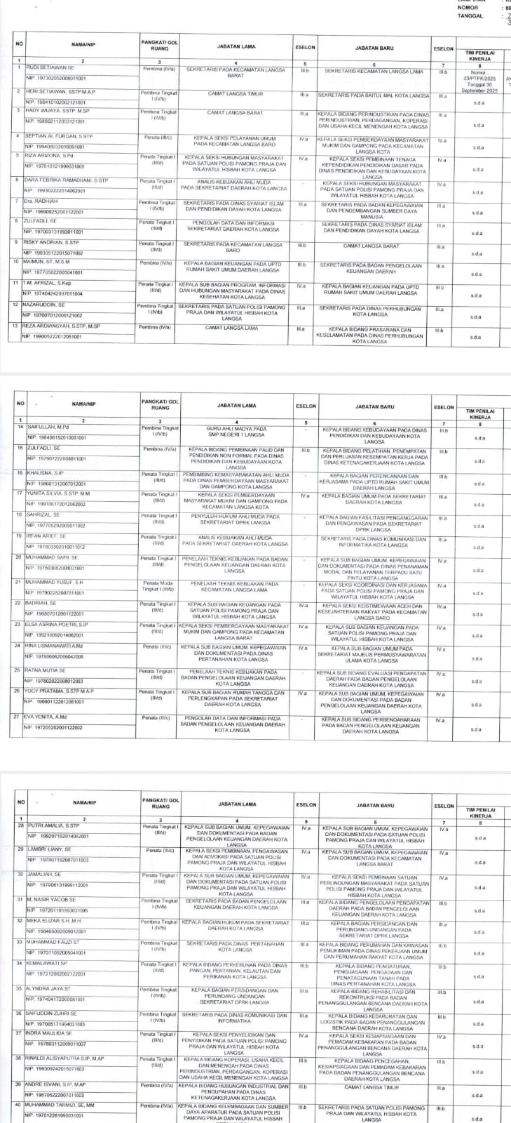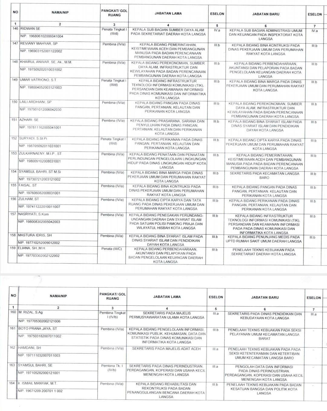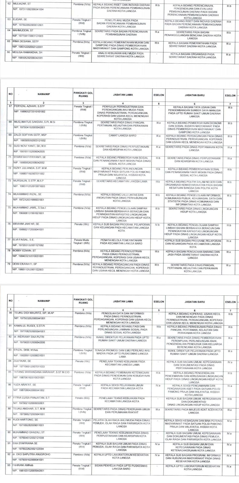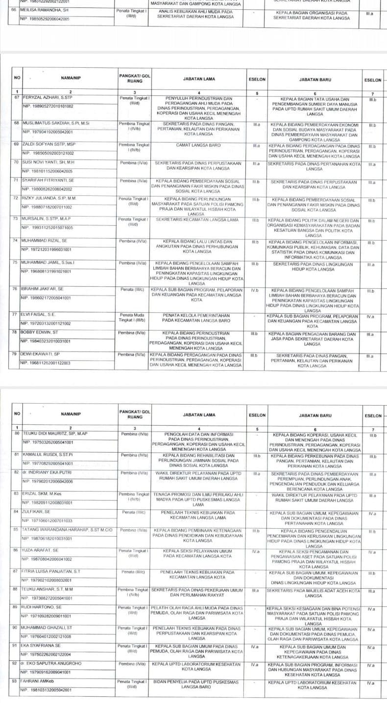 Berikut nama-nama 186 pejabat Pegawai Negeri Sipil dalam Jabatan Pimpinan Tinggi Pratama (Eselon II), Administrator (Eselon III) dan Pengawas (Eselon IV) di Lingkungan Pemerintah Kota Langsa yang dilantik: