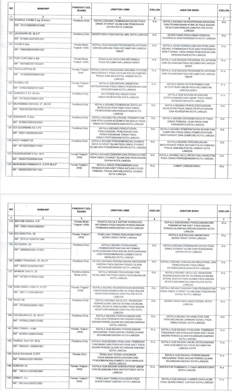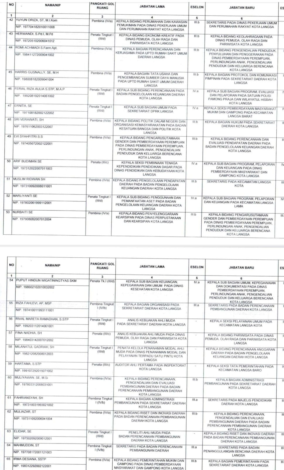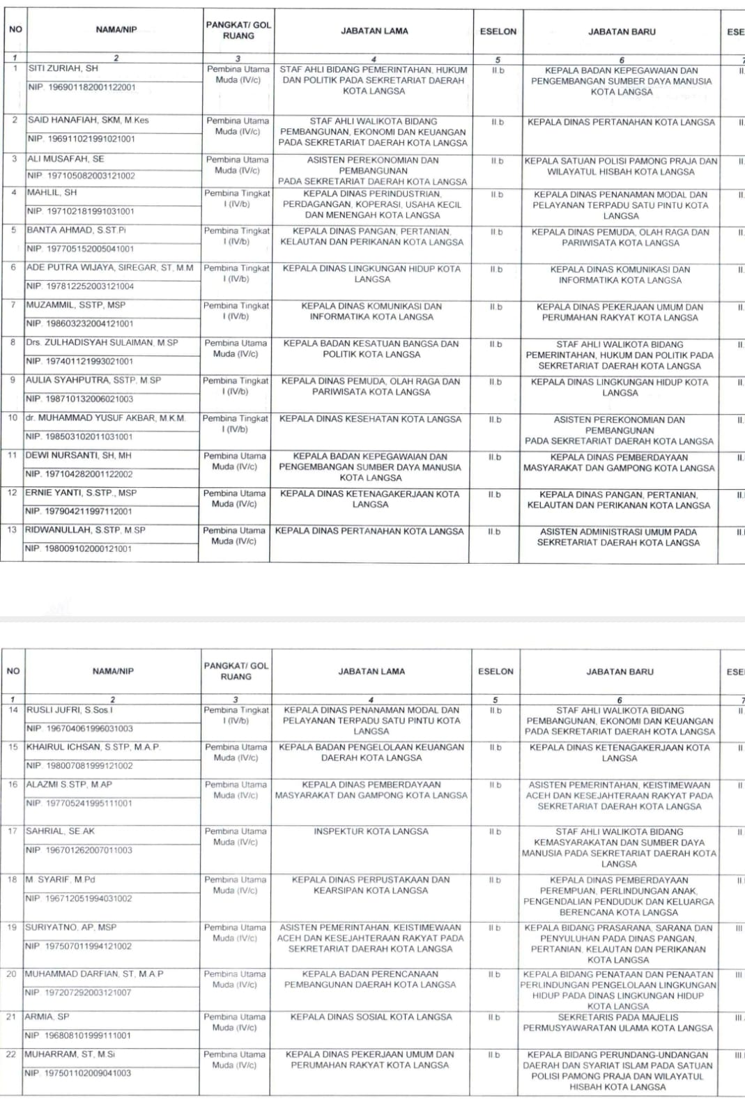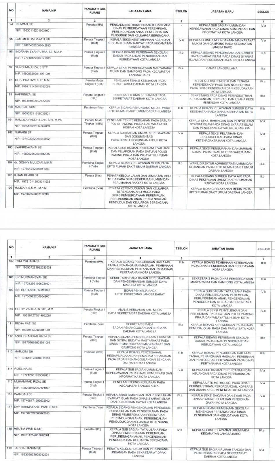 Berikut nama-nama 186 pejabat Pegawai Negeri Sipil dalam Jabatan Pimpinan Tinggi Pratama (Eselon II), Administrator (Eselon III) dan Pengawas (Eselon IV) di Lingkungan Pemerintah Kota Langsa yang dilantik: