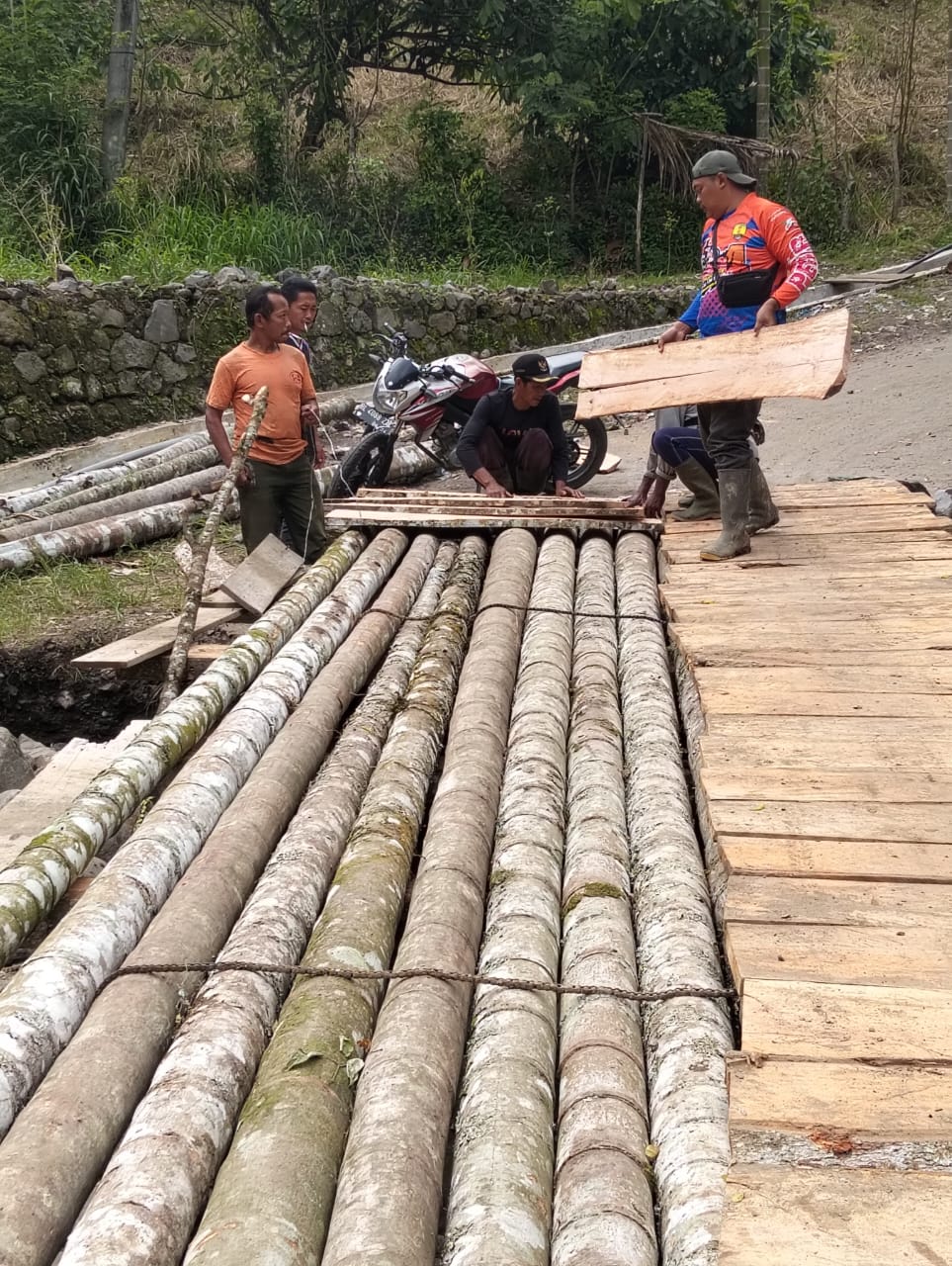 Pantauan di lokasi, masyarakat tampak bahu-membahu mengerjakan pembangunan jembatan dari papan dan kayu. Meski bersifat sementara, jembatan tersebut saat ini sudah dapat dilalui masyarakat untuk menunjang aktivitas sehari-hari.