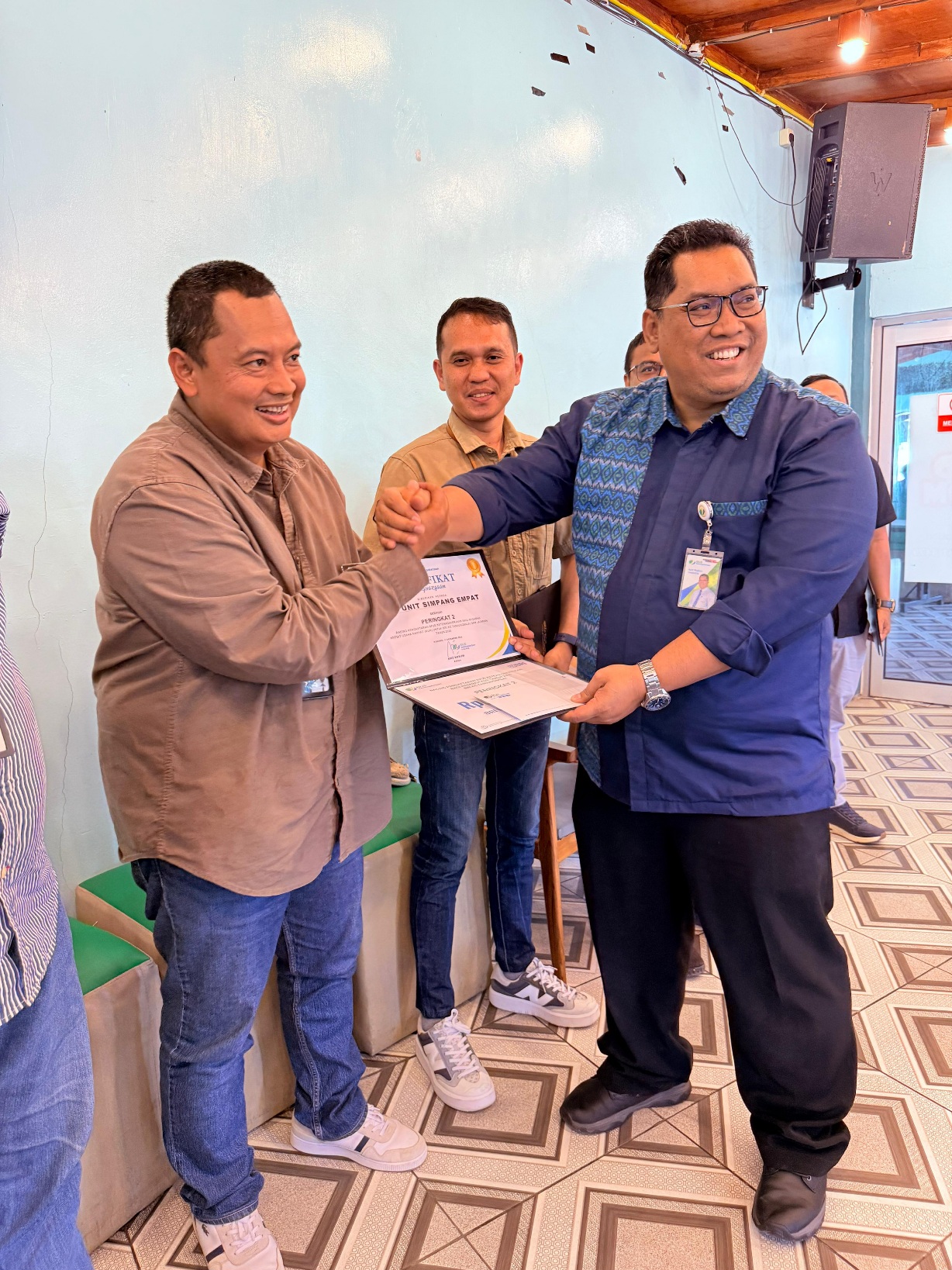 TANJUNGBALAI (Waspada.id) : BPJS Ketenagakerjaan Cabang Kisaran menyerahkan penghargaan kepada para pemenang Racing pendaftaran kepesertaan BPJS Ketenagakerjaan bagi nasabah Kredit Usaha Rakyat (KUR) BRI, di Cafe WBF Kisaran, Kamis (11/12).
