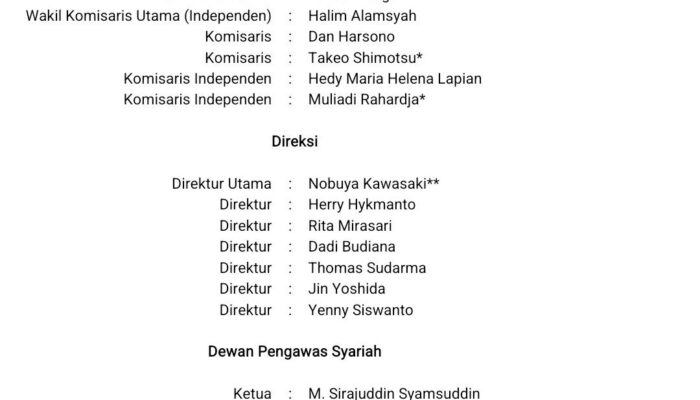 RUPST juga menyetujui untuk mengangkat Nobuya Kawasaki sebagai Direktur Utama, yang telah menerima persetujuan OJK melalui penilaian kemampuan dan kepatutan, serta mengangkat kembali Anggota Dewan Komisaris dan Anggota Direksi serta Anggota Dewan Pengawas Syariah lainnya yang telah berakhir masa jabatannya untuk masa jabatan yang baru.
