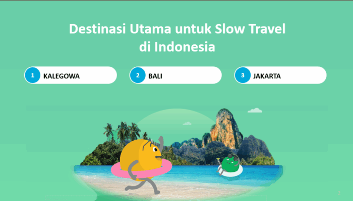 Dari sembilan negara di Asia, data Agoda menunjukkan bahwa wisatawan slow travel memilih masa inap terpanjang di Rayong (Thailand), Kalegowa (Indonesia), Seoul (Korea Selatan), Tokyo (Jepang), Nha Trang (Vietnam), Pulau Boracay (Filipina), Taipei (Taiwan), Kuala Lumpur (Malaysia), dan Chennai (India).