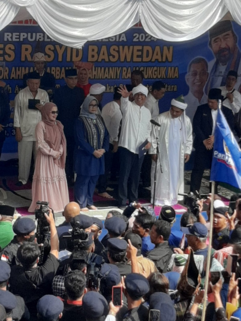 SIMALUNGUN (Waspada): Bakal Calon presiden (Bacapres) RI, Anies Rasyid Baswedan disambut ribuan warga saat hadir di tanah ‘Habonaron Do Bona’ tepatnya di Pondok Persulukan Serambi Babussalam, Kecamatan Hatonduhan, Kabupaten Simalungun, Jumat (03/11/2023) sekira pukul 08.30.