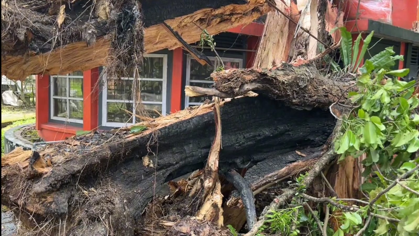 Bangunan kantor Pos Indonesia yang berada di bawahnya mengalami kerusakan pasca ditimpa pohon yang berdiameter lebih dari satu meter itu.
