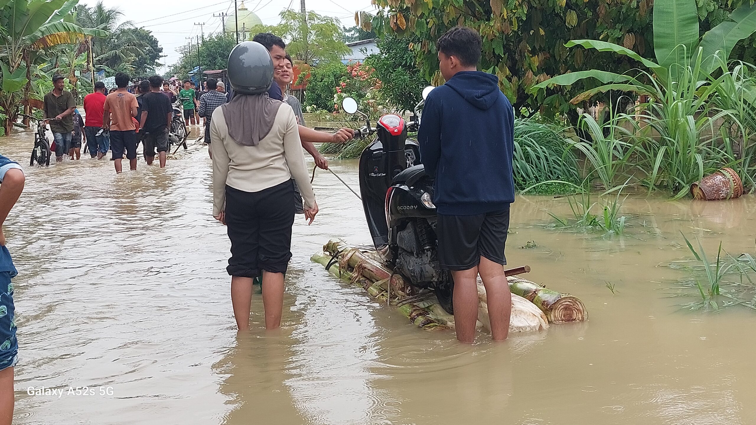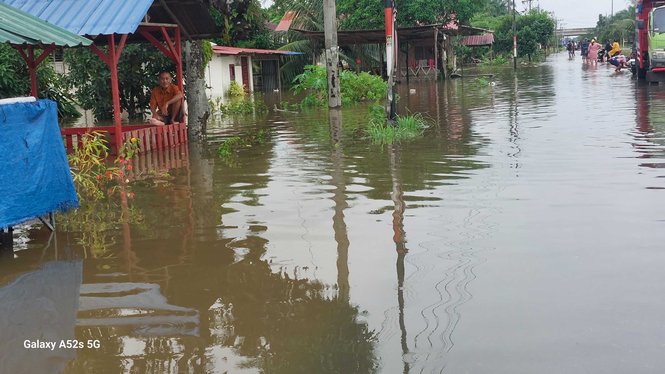 “Jalan gak bisa dilewati kereta (Sepedamotor), banjir dalam. Jalan di depan sana juga dalam sampai sepinggang,” ujar salah seorang warga.