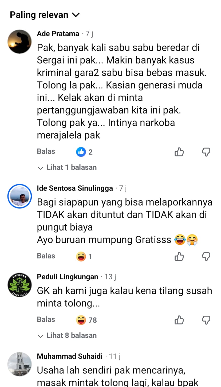 Alih-alih bukannya mendapat informasi, ratusan netizen malah merujak dengan memberikan komentar negatif. Seperti dikatakan Ade Pratama dalam komentarnya ” Pak, banyak kali sabu sabu beredar di Sergai ini pak… Makin banyak kasus kriminal gara-gara sabu bisa bebas masuk. Tolong la pak… Kasian generasi muda ini… Kelak akan di minta pertanggungjawaban kita ini pak. Tolong pak ya… Intinya narkoba merajalela pak” tulis Ade Pratama.