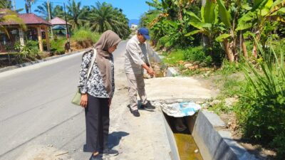 ANGGOTA DPRD Sumut HM Subandi (kiri depan) meninjau drainase di Desa Kuta Kurung, Kecamatan STM Hilir, Deli Serdang, yang pembangunannya tidak memuaskan. Waspada/Ist