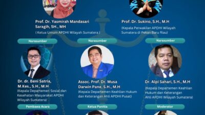 Usai keynote speaker menyampaikan pengantarnya. Webinar ini dilanjutkan oleh tiga narasumber, yakni Dr. dr. Beni Satria, M.Kes, S.H, M.H selaki Kepala Department Sosial dan Kesehatan Masyarakat APDHI Wilayah Sumatera, Assoc. Prof. Dr. Musa Darwin Pane, S.H, M.H selaku Kepala Department Keahlian Hukum dan Keterangan Ahli APDHI Pusat, serta Dr. Alpi Sahari, S.H, M.H selaku Kepala Department Keahlian Hukum dan Keterangan Ahli APDHI Wilayah Sumatera.(m28)