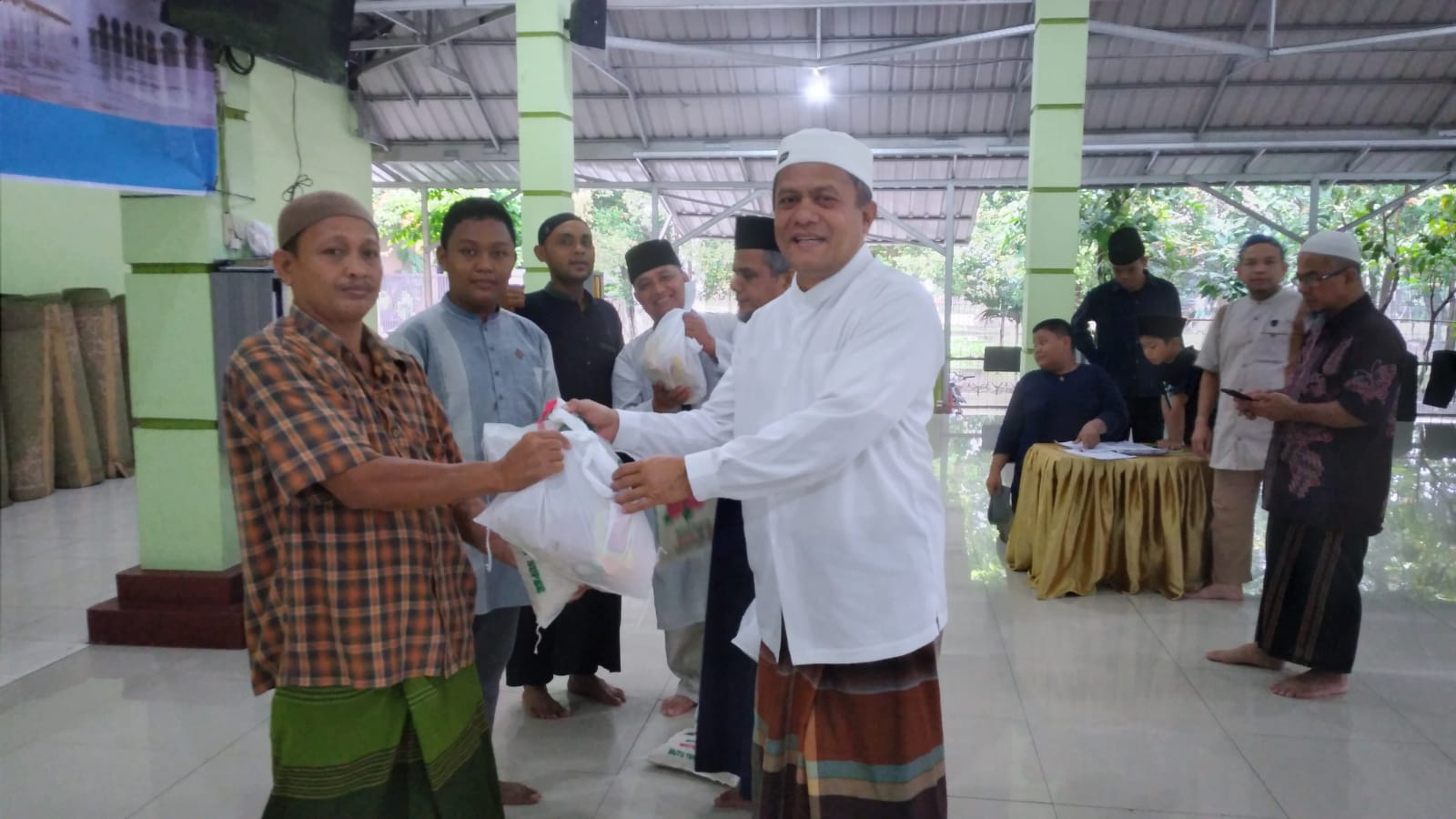 Ketua BKM Asy Syafi’iyah sedang menyerahkan bantuan Pemko Medan berupa sembako kepada warga yang kurang mampu.