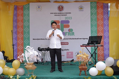 MEDAN (Waspada): Inisiator Gerakan Gadget Sehat Sahabat, Prof.Ridha Dharmajaya menjadi keynote speaker , memberikan motivasi kepada para hadirin di acara SMA Swasta Budi Agung Fair, Medan Marelan, Kamis (22/6).