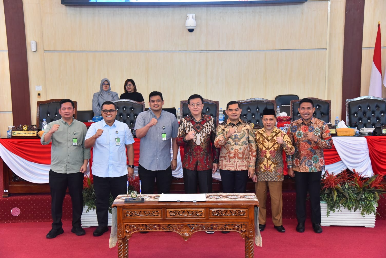 Pimpinan DPRD Kota Medan bersama Wali Kota Medan M Bobby Nasution melakukan penandatanganan R APBD 2025 pads rapat paripurna di gedung dewan, Selasa (10/9). Waspada/yuni naibaho