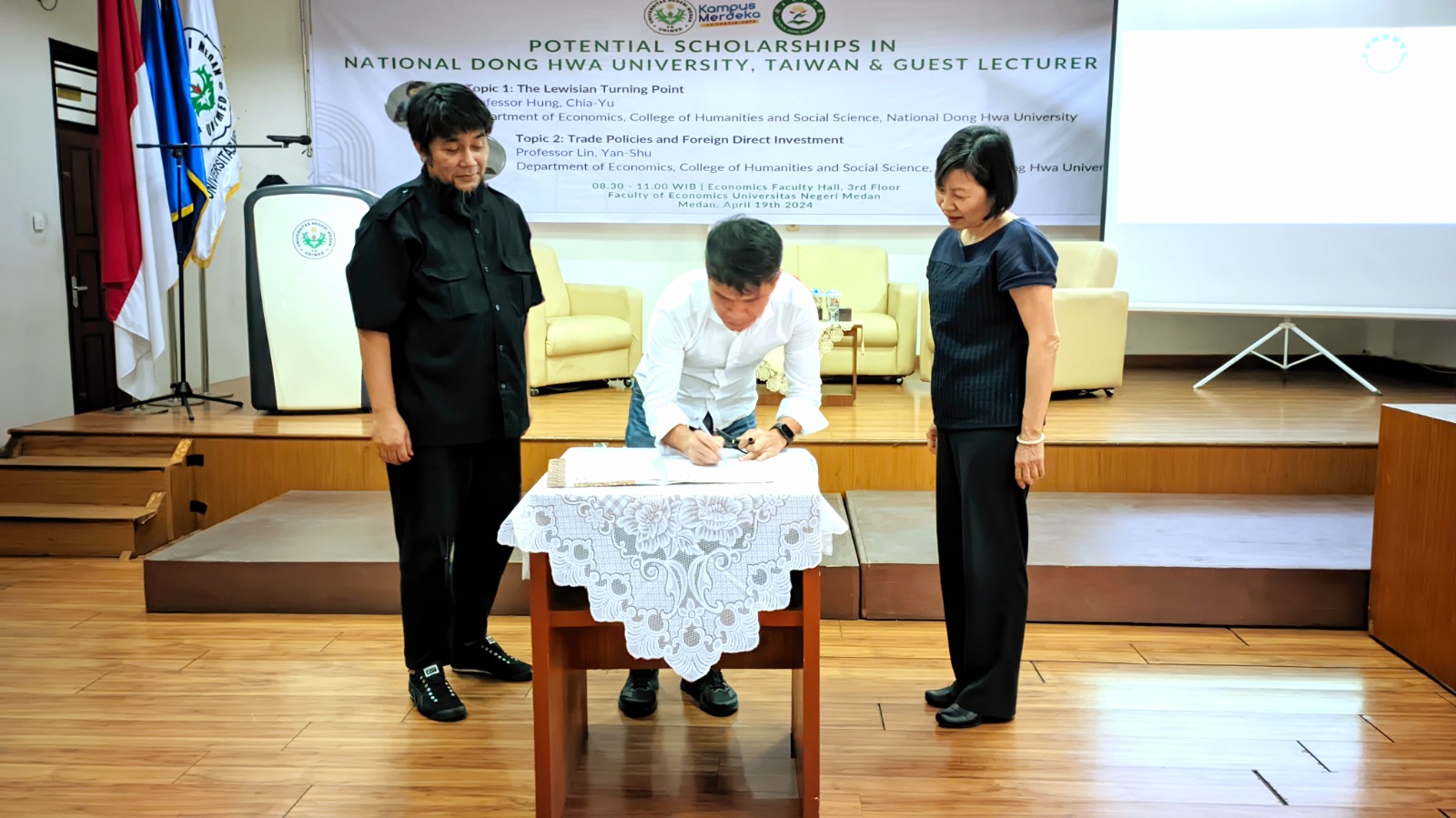 Kedua dosen tamu internasional tersebut adalah Prof. Hung, Cia Yun dengan topik the Lewisian turning point dan Prof. Lin, Yan-Shu dengan topik trade policies and foreign direct investment. Selain membahas topik publikasi internasional mereka, kedua guru besar itu juga membuka jalan bagi lulusan FE Unimed dan para dosen yang ingin melanjutkan studi magister dan doktoral di perguruan tinggi tersebut dengan program beasiswa.
