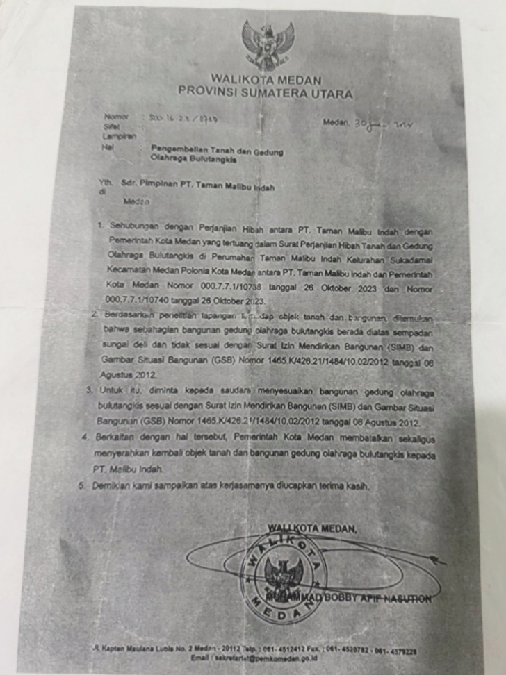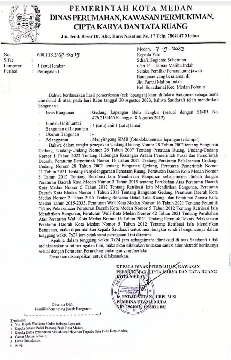 Sementara itu, persoalan legalitas bangunan juga pernah menjadi perhatian pemerintah. Dinas Perumahan, Kawasan Permukiman, Cipta Karya dan Tata Ruang (Perkim Cikataru) Kota Medan pada 2023 telah melayangkan surat peringatan kepada pengembang, PT Taman Malibu Indah.