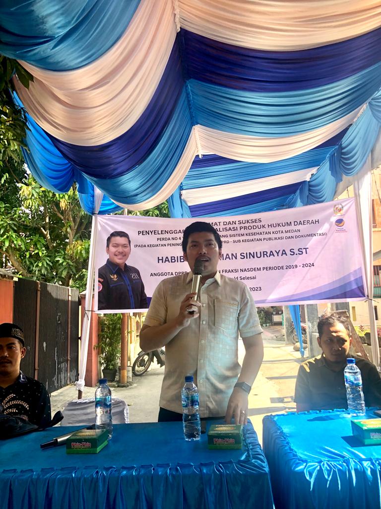 MEDAN (Waspada): Anggota DPRD Kota Medan, Habiburrahman Sinuraya mensosialisasikan Peraturan Daerah (Perda) nomor 4 tahun 2012 tentang Sistem Kesehatan Kota Medan (SKKM) di Jalan Setia Gg Kelurga Kel Tanjung Rejo, Kec Medan Sunggal, Senin (6/3).