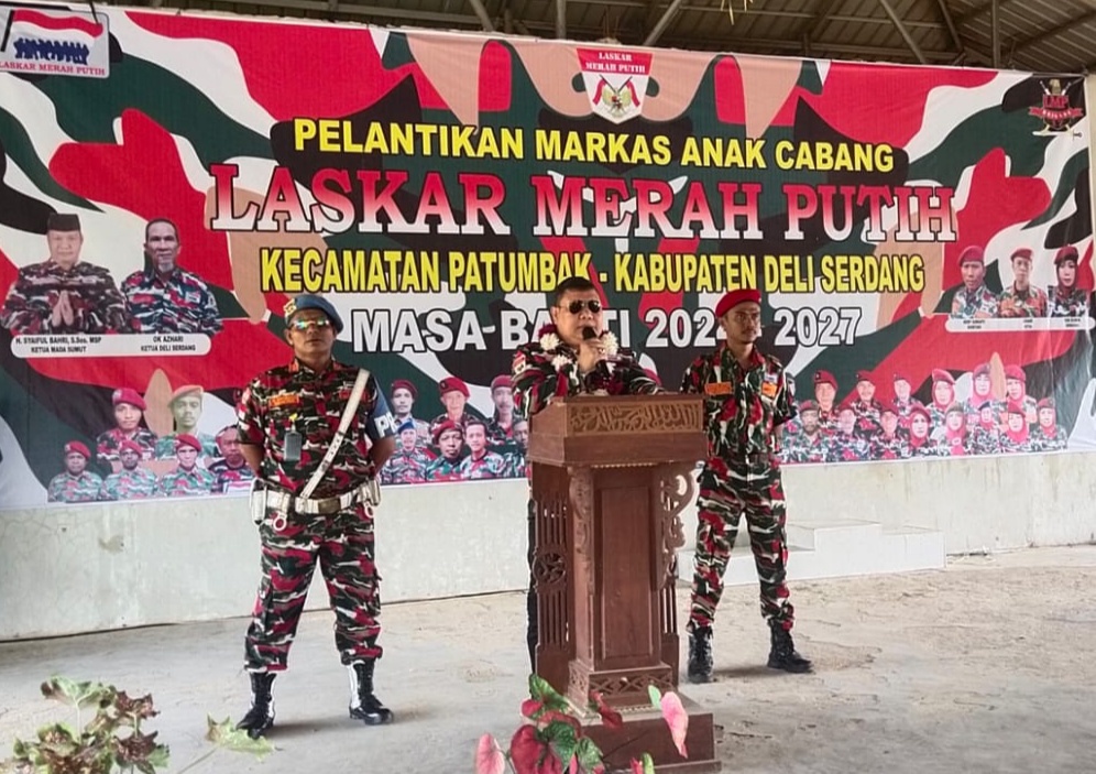 MEDAN (Waspada) : Pelantikan Markas Cabang (MAC) Laskar Merah Putih (LMP) Kecamatan Patumbak digelar meriah di Padepokan Tunggal Riso, Jalan Sedap Malam Landasan Lama, Kecamatan Patumbak, Deli Serdang, pada Minggu, 30 Juni 2024.
