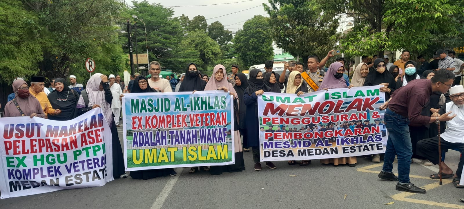 Dipimpin Kordinator Aksi Ustadz Nurssrianto, kedatangan mereka untuk menyampaikan Tiga pernyataan sikap terkait rencana eksekusi dan penggusuran Masjid Al Ikhlas, yang terletak di eks Komplek Veteran, Dusun VIII Desa Medan Estate, Kecamatan Percut Seituan, Kabupaten Deliserdang.