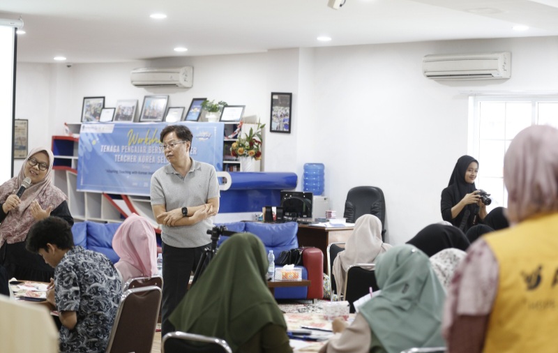 MEDAN (Waspada): Master Teacher dari Korea Selatan, Park Jang Hwan berbagi ilmu di Universitas Muhammadiyah Sumatera Utara pada acara ”Workshop Tenaga Pengajar bersama Master Teacher Korea Selatan”, dengan tema Adapting Teaching With Korean Insight for Young Education di Perpustakaan UMSU, Jalan Kapten Muktar Basri Medan, Kamis (25/1).