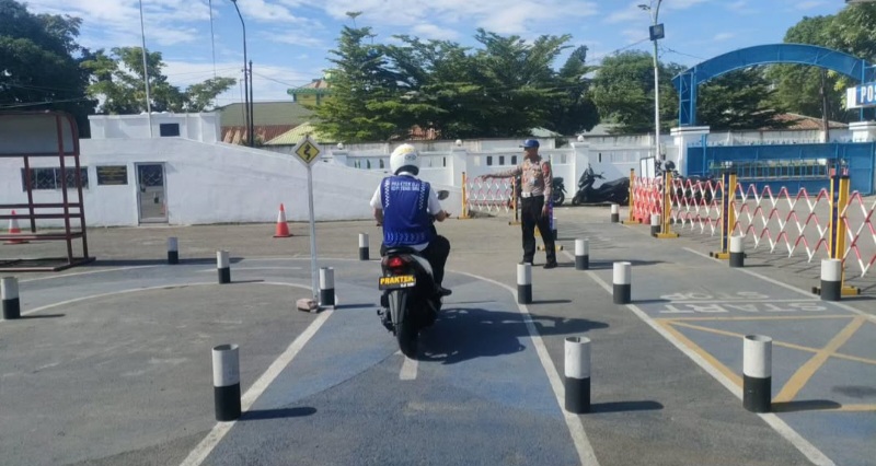 Seorang pemohon SIM C Baru sedang melaksanakan ujian praktek di lapangan praktek SIM Satlantas Polrestabes Medan.