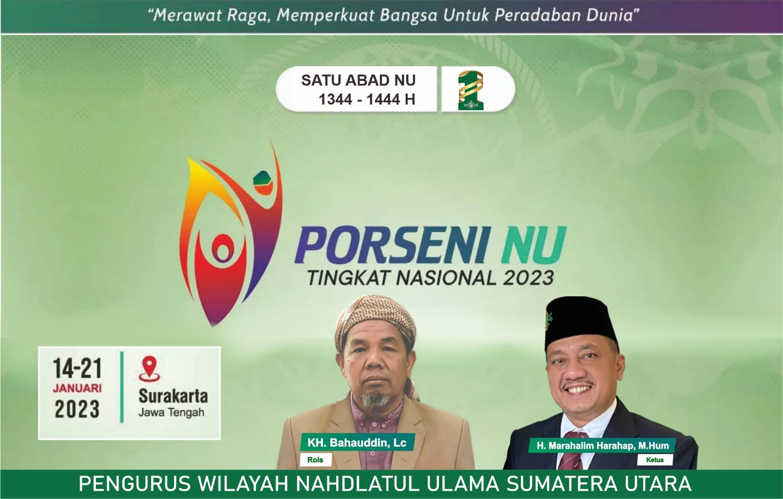 MEDAN (Waspada): Dalam waktu dekat ini Nahdlatul Ulama(NU) akan memasuki usia 100 tahun (1 Abad). Salah satu kegiatan yang dilaksanakan dalam rangka menyemarakkan Peringatan 1 Abad NU, Pengurus Besar Nahdlatul Ulama (PBNU) Pekan Olahraga dan Seni (PORSENI) NU di Solo pada tanggal 14-21 Januari 2023, tiga minggu sebelum puncak peringatan 1 Abad NU, yaitu tanggal 7 Februari 2023 atau bertepatan tanggal 16 Rajab 1444 H.