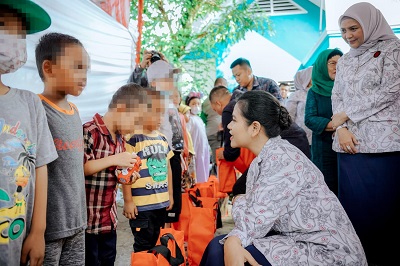 Didampingi Sekretaris YKI Cabang Kota Medan Ny Ismiralda Wiriya Alrahman, Dewan Pengawas dan Dewan Pembina YOAM Prof dr Bidasari Lubis, Ketua Yayasan YOAM Atika Rahmi, Donatur Bantuan Rutin YOAM dr Otman Siregar Sp OT (K), Camat Medan Tuntungan Hendra Arjudanto beserta Ketua TP PKK Kecamatan Medan Tuntungan, Ny Kahiyang Ayu selanjutnya menyapa dan berinteraksi dengan anak-anak pejuang kanker lainnya.