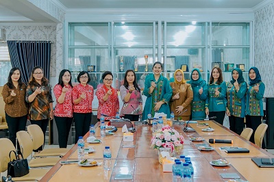 MEDAN (Waspada): Dengan penuh kehangatan, Ketua TP PKK Kota Medan Ny Kahiyang Ayu M Bobby Afif Nasution menerima kedatangan rombongan TP PKK Kabupaten Minahasa Selatan (Minsel), Provinsi Sulawesi Utara di Kantor PKK Kota Medan, Jalan Rotan Proyek, Senin (15/5).