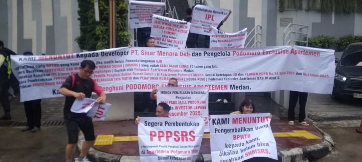 Para penghuni yang tergabung dalam Perkumpulan Podomoro Deli Medan Bersatu menyuarakan sejumlah tuntutan, mulai dari penerbitan Akta Jual Beli (AJB), penyerahan Sertifikat Hak Milik Satuan Rumah Susun (SHMSRS), hingga pengembalian dana Bea Perolehan Hak atas Tanah dan Bangunan (BPHTB) yang telah lama dititipkan kepada pengembang.