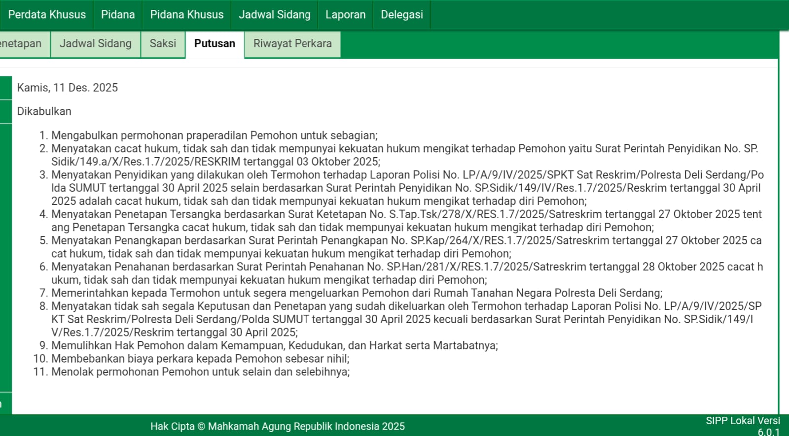 Hakim menyatakan proses penyidikan cacat hukum, mulai dari surat perintah penyidikan hingga penahanan. Serangkaian tindakan aparat dinilai tidak sah dan tidak memiliki kekuatan mengikat.