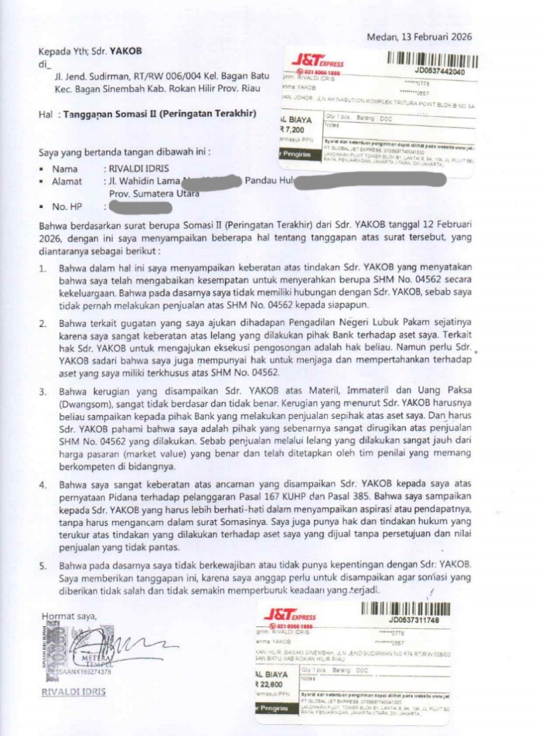 MEDAN (Waspada.id): Sengketa kepemilikan aset berupa SHM No. 04562 kian memanas setelah Rivaldi Idris menyampaikan keberatan resmi atas somasi yang dilayangkan Yakob. Dalam surat tanggapan tertanggal 13 Februari 2026, Rivaldi menilai somasi tersebut berisi tuduhan yang tidak berdasar dan mengabaikan fakta bahwa dirinya tidak pernah menjual aset tersebut secara langsung kepada pihak mana pun.