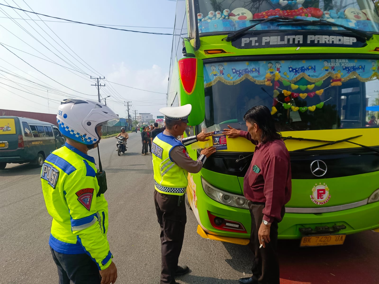 “Dalam kegiatan ini kami memberikan edukasi tentang kamseltibcar lantas kepada calon penumpang dan keluarga yang mengantar agar selalu berhati-hati dalam berkendara di jalan raya serta tetap mematuhi peraturan lalu lintas demi keselamatan bersama,” ujar AKP Andi K. Barus.