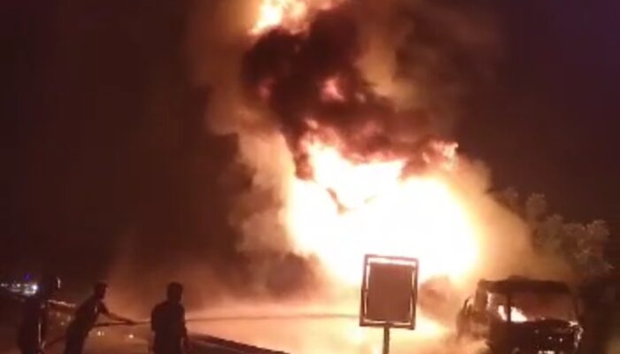 MEDAN (Waspada): Satu unit mobil tangki pengangkut Bahan Bakar Minyak (BBM) Pertamina terbakar di jalan tol Belawan-Medan-Tanjungmorawa (Belmera), sekira pukul 19.30-20:00 WIB, Kamis (3/8/2023).