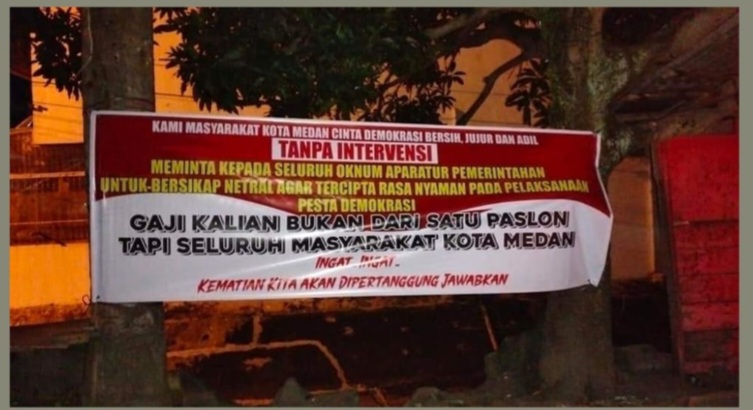 Salah satu spanduk yang terpampang di Jalan Lubuk Kuda misalnya, lokasinya tidak jauh dari Kantor Lurah Sei Kera Hulu, yang bertuliskan ‘Kami Masyarakat Kota Medan Cinta Demokrasi yang Jujur, Bersih dan Adil, Tanpa Intervensi, Meminta Aparatur Pemerintahan Untuk Bersikap Netral Agar Tercipta Rasa Nyaman Pada Pelaksanaan Pesta Demokrasi, Gaji Kalian Bukan Dari Salah Satu Paslon Tapi Dari Seluruh Masyarakat Kota Medan, Ingat Ingat Kematian Kita di Pertanggung Jawabkan’.