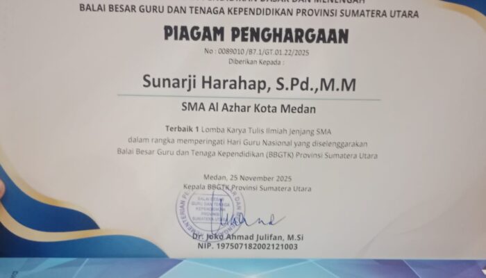 Sunarji Harahap, S.Pd.,M.M. sebagai Guru Best Teacher SMA Unggulan AL Azhar Medan berhasil meraih juara 1 dengan Judul tulisan karya ilmiah populer ”Transformasi Hebat Menuju Pembelajaran Mendalam dan Berkarakter“.