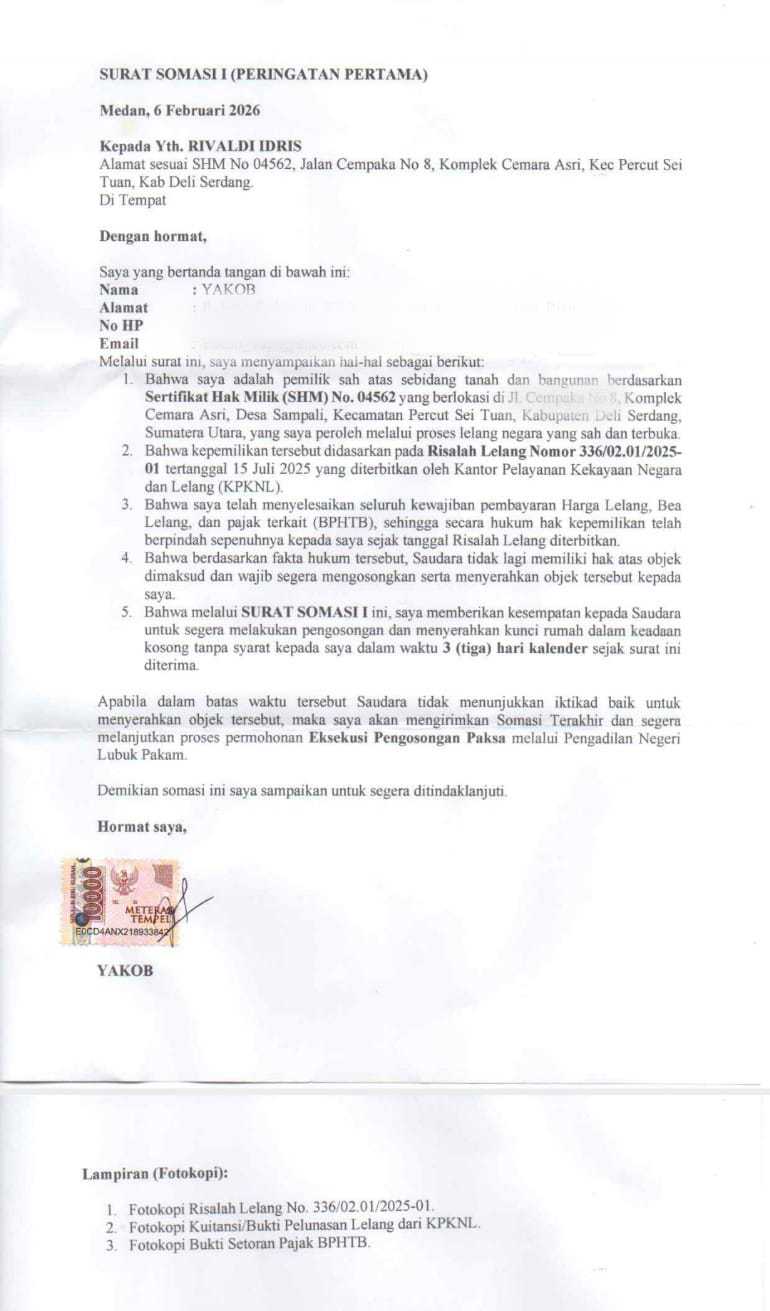 MEDAN (Waspada.id): Sebuah surat somasi tertanggal 6 Februari 2026 yang beredar menuntut pengosongan paksa rumah milik Rivaldi Idris dalam tempo 3 hari kalender menimbulkan tuntutan hukum dan pertanyaan serius: apakah eksekusi hak milik boleh dilakukan tanpa putusan pengadilan yang memiliki kekuatan hukum tetap?