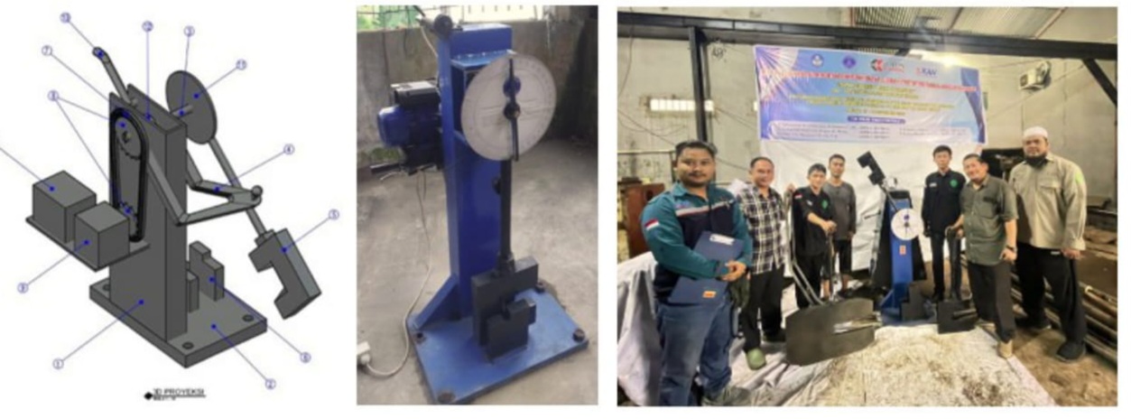 Dari kiri ke kanan : Gambar Desain, Mesin Uji Impak Charpy Semi Otomatis, dan tim peneliti prototipe Prodi Teknik Mesin UMA beserta tim asesor Lembaga KAN setelah selesai Uji Kalibrasi Mesin Impak Charpy Semi Otomatis.