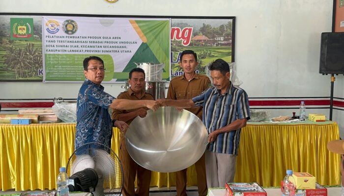 MEDAN (Waspada.id): Tim Pengabdian Kepada Masyarakat dosen Universitas Sumatera Utara (USU) di bawah koordinasi Dr. Dolly Sojuangan Siregar, S.P., M.P., melakukan inovasi pengabdian masyarakat melalui program “Pelatihan Pembuatan Produk Gula Aren yang Terstandarisasi sebagai Produk Unggulan Desa Sungai Ular, Kecamatan Secanggang, Kabupaten Langkat”, Selasa (7/10).
