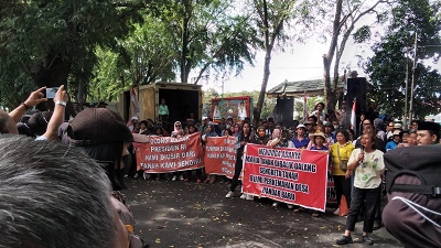 MEDAN (Waspada): Seratusan warga Bandar Baru, Kecamatan Sibolangit, Kabupaten Deli Serdang menggelar aksi unjukrasa di depan gedung DPRD Sumut, Rabu (25/1). Mereka dengan tegas menolak penggusuran bumi perkemahan (Bumper) Sibolangit dan mengklaim bahwa Pemprovsu tak pernah punya aset di kawasan itu.