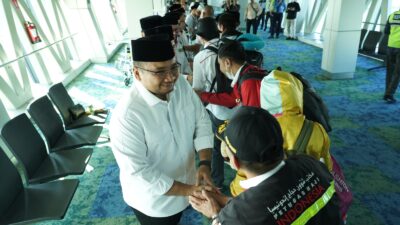 SAMBUT PPIH: Gus Yaqut menyambut kedatangan petugas PPIH Arab Saudi di Bandara Internasional Soekarno – Hatta Jakarta, Sabtu (5/8). Waspada/Ist.