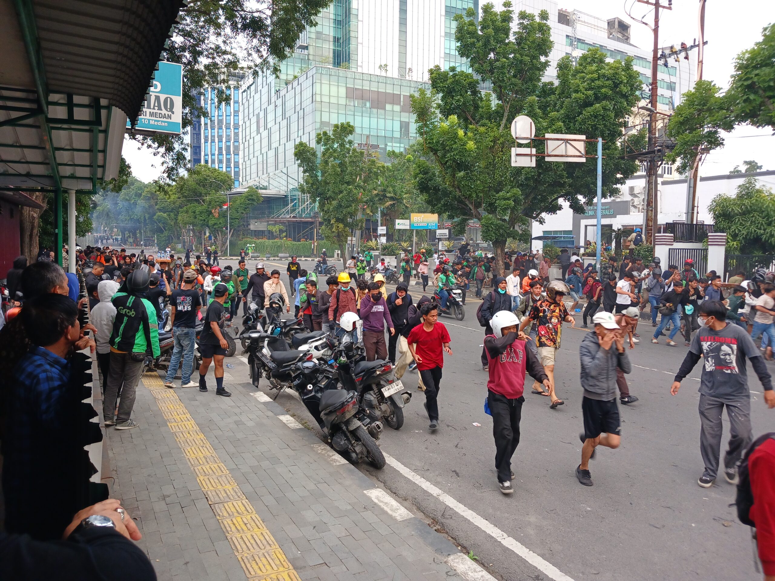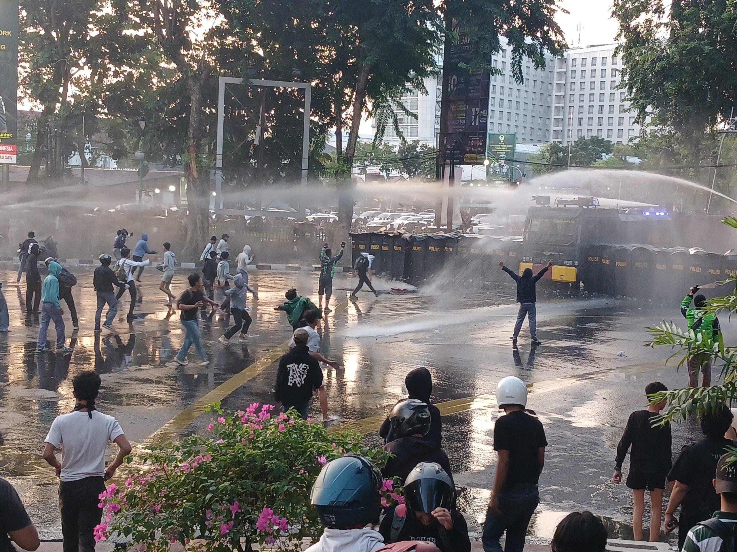 Kericuhan terjadi di hampir setiap titik, saat aparat memukul mundur, massa melawan dengan lemparan batu yang kemudian dibalas penegak hukum dengan meriam air dan gas air mata.