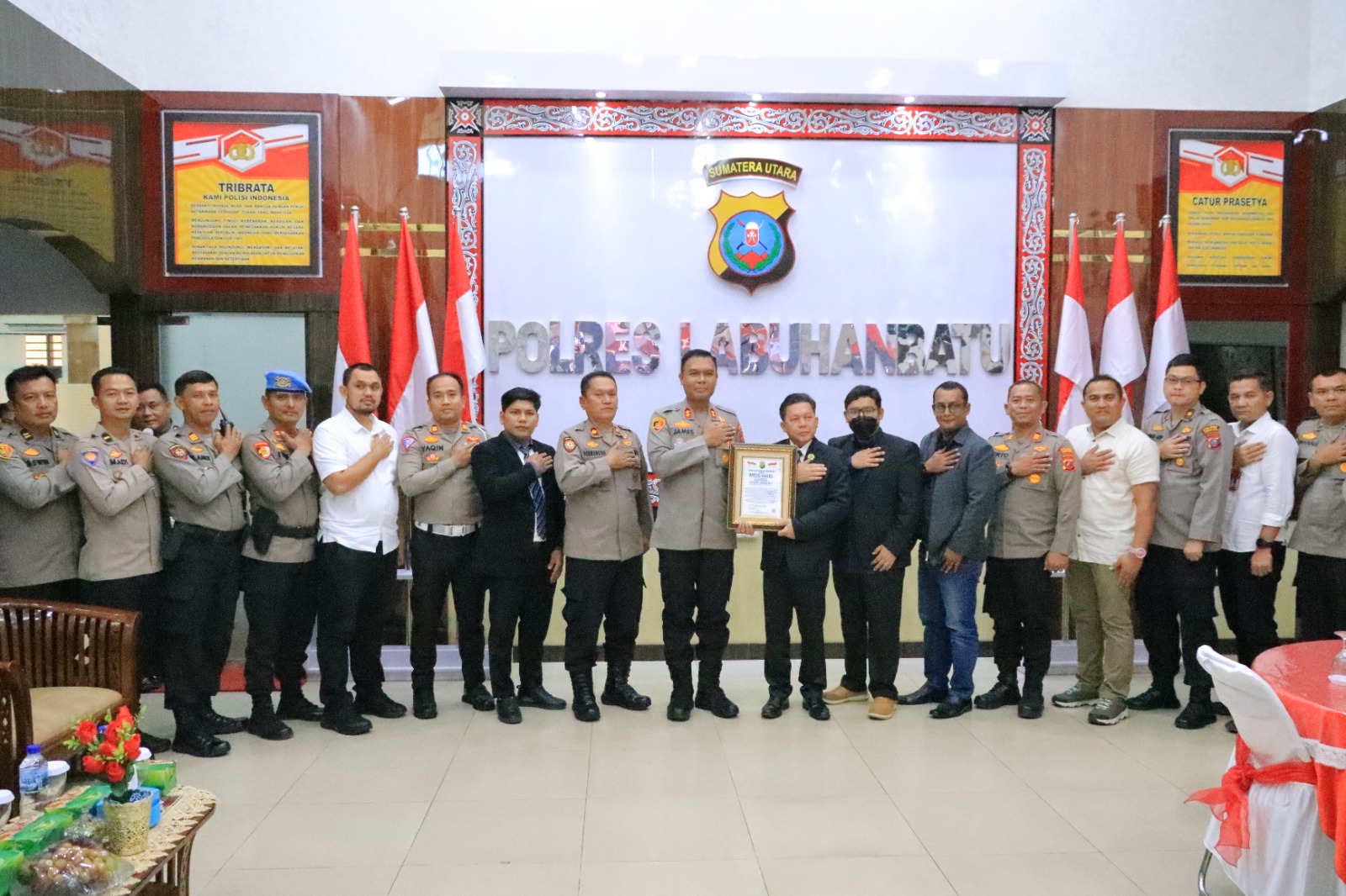Penyerahan penghargaan tersebut dilaksanakan di Aula Yan Piter, Polres Labuhanbatu dihadiri oleh Sekda H. Muhammad Suib dan sejumlah Pejabat Pemkab mewakili Bupati Labura.