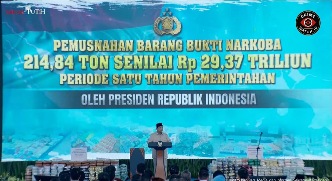 JAKARTA (Waspada.id): Presiden Republik Indonesia, Prabowo Subianto, secara langsung memimpin pemusnahan barang bukti narkotika seberat 214,84 ton, senilai sekitar Rp 29,37 triliun, yang berhasil disita oleh Kepolisian Negara Republik Indonesia (Polri) sepanjang periode Oktober 2024–Oktober 2025, Rabu (29/10/2025) di Lapangan Bhayangkara, Jakarta Selatan.