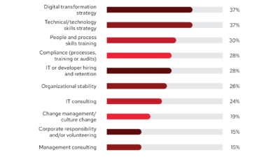 Di antara prioritas pembiayaan non-TI di luar TI, 37% responden memilih strategi transformasi digital dan pelatihan keterampilan teknis/teknologi. Pelatihan keterampilan karyawan/proses berada di urutan ketiga (30%), dengan IT atau perekrutan dan retensi developer berada di urutan terakhir (28%). Semua prioritas pembiayaan non-TI teratas tahun ini melibatkan peningkatan keterampilan dan karyawan, mungkin terkait dengan kondisi pasar yang berkembang dan pasar tenaga kerja yang ketat, dan mendorong perusahaan untuk menjadi lebih kreatif tidak hanya dalam menentukan strategi dan prioritas mereka, tetapi juga bagaimana mereka merekrut, mempertahankan, dan reskilling.