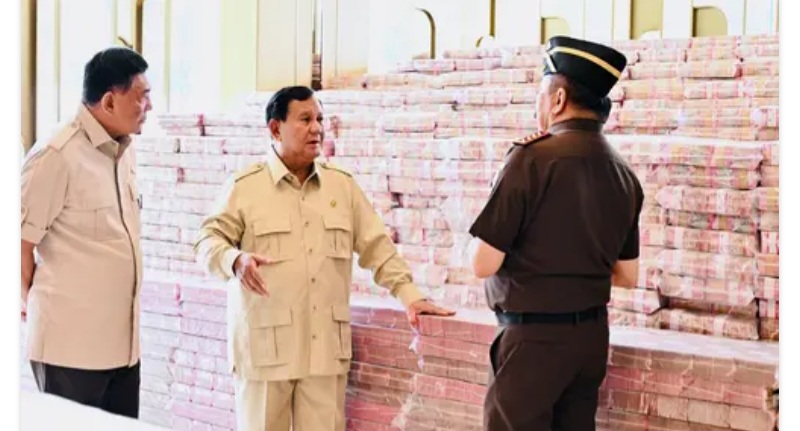 Uang tersebut disusun rapi di Gedung Utama Kejaksaan Agung, Jakarta Selatan dalam acara penyerahan uang pengganti kerugian negara dalam kasus korupsi ekspor CPO kepada negara, pada Senin (20/10/2025). Penyerahan ini disaksikan Prabowo.