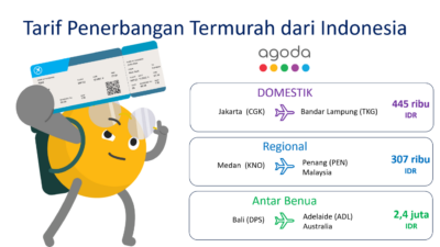Dengan ribuan rute penerbangan dari Indonesia yang dapat dipilih di Agoda, wisatawan Indonesia dapat memperoleh harga mulai dari 445 ribu rupiah. Penerbangan termurah di Indonesia berada di peringkat ke-9 di antara sepuluh pasar Asia Pasifik untuk tarif domestik terendah. Thailand dan Filipina – yang sama-sama menawarkan penerbangan domestik seharga 123 ribu rupiah – menempati posisi teratas.