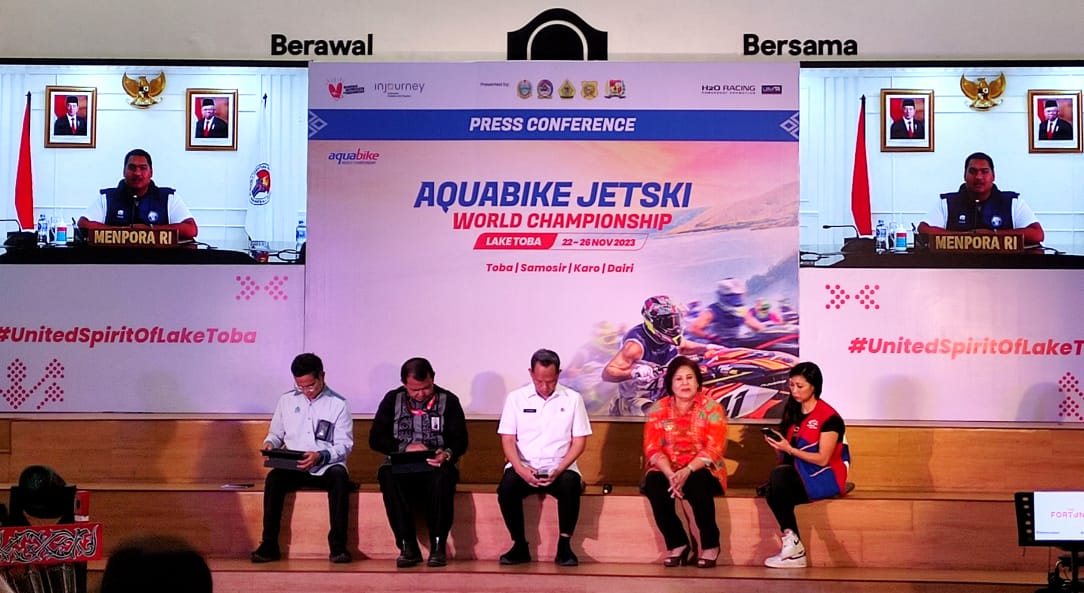Hadir langsung dalam konferensi pers Aquabike Jetski World Championship di antaranya Asisten Deputi Pengembangan Pariwisata Berkelanjutan Kementerian Koordinator Bidang Kemaritiman dan Investasi Cosmas Harefa, mewakili Pj Gubernur Sumut Hassanuddin, Kadis Kebudayaan dan Pariwisata Sumut Zumi Sulthony, Bupati Karo Cory Sebayang dan Dirut BPODT Jimmy Bernando Panjaitan.